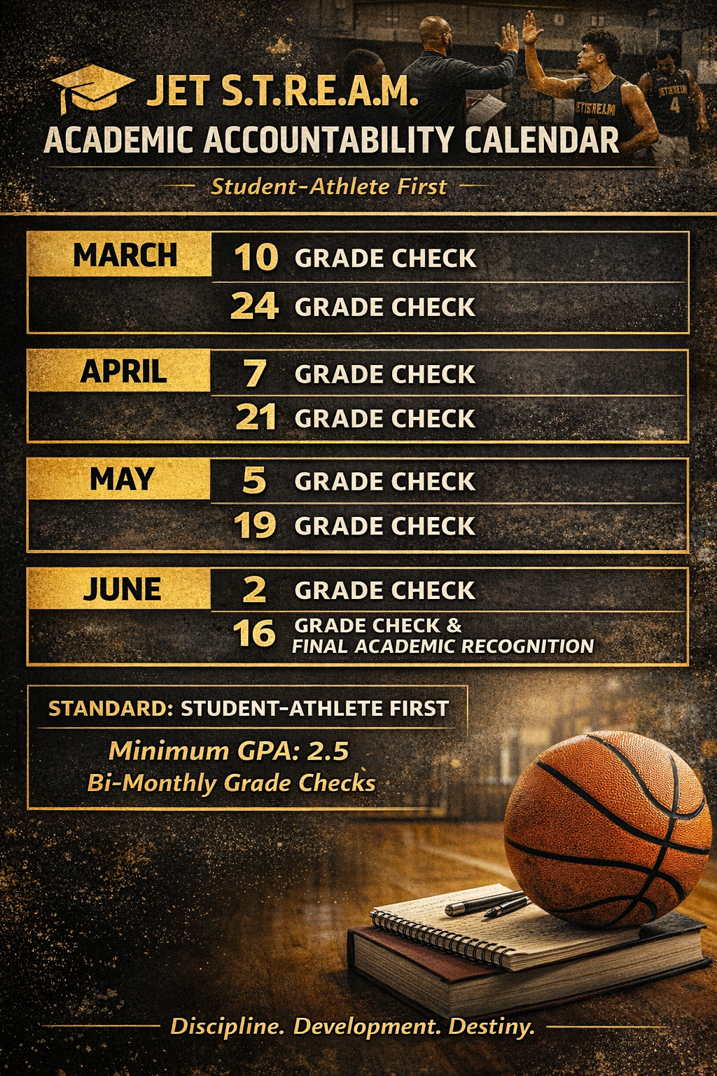 From March through June, athletes will participate in scheduled grade checks twice per month: